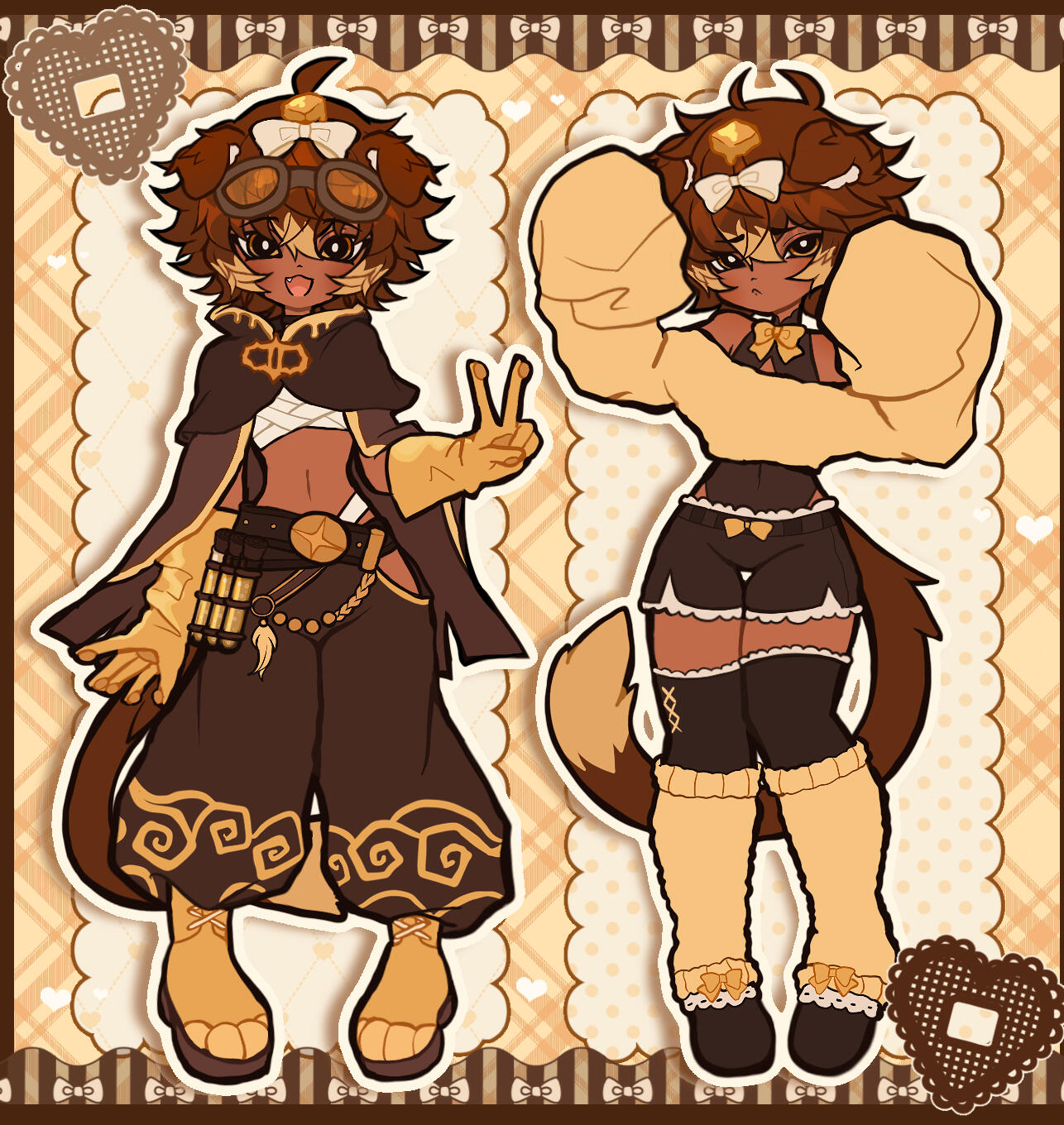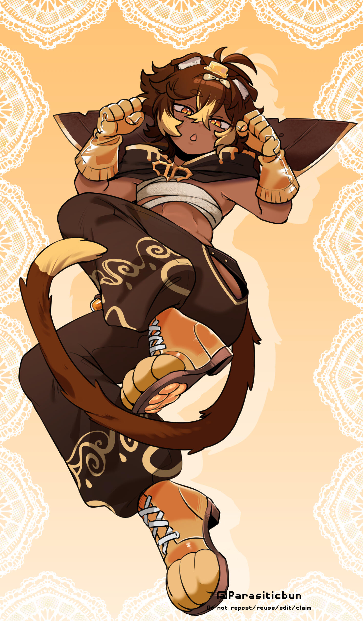 ・A pair of toe bean stockings are worn with a similar lace pattern to the shorts. The toe beans themselves, glow an amber yellow-brown