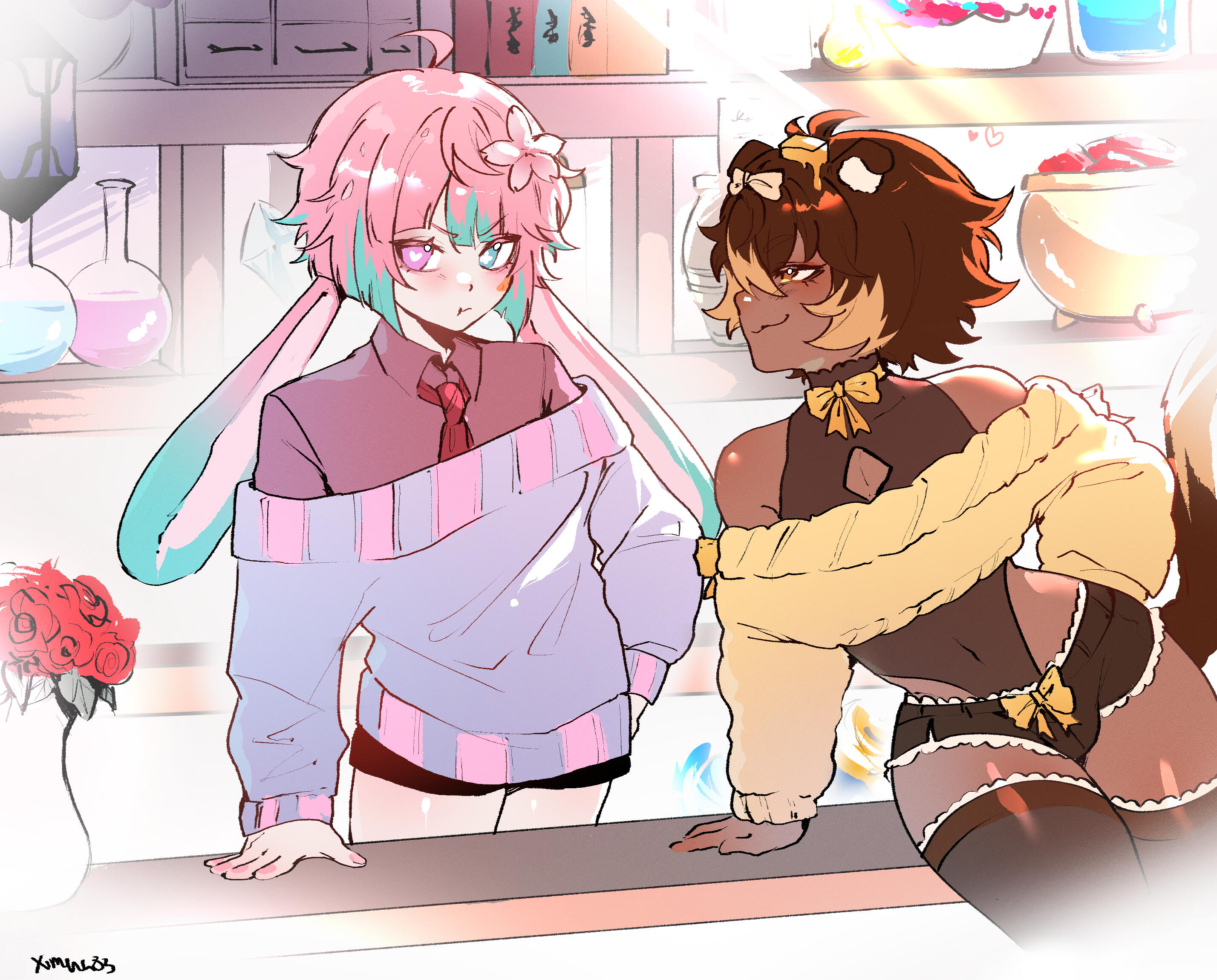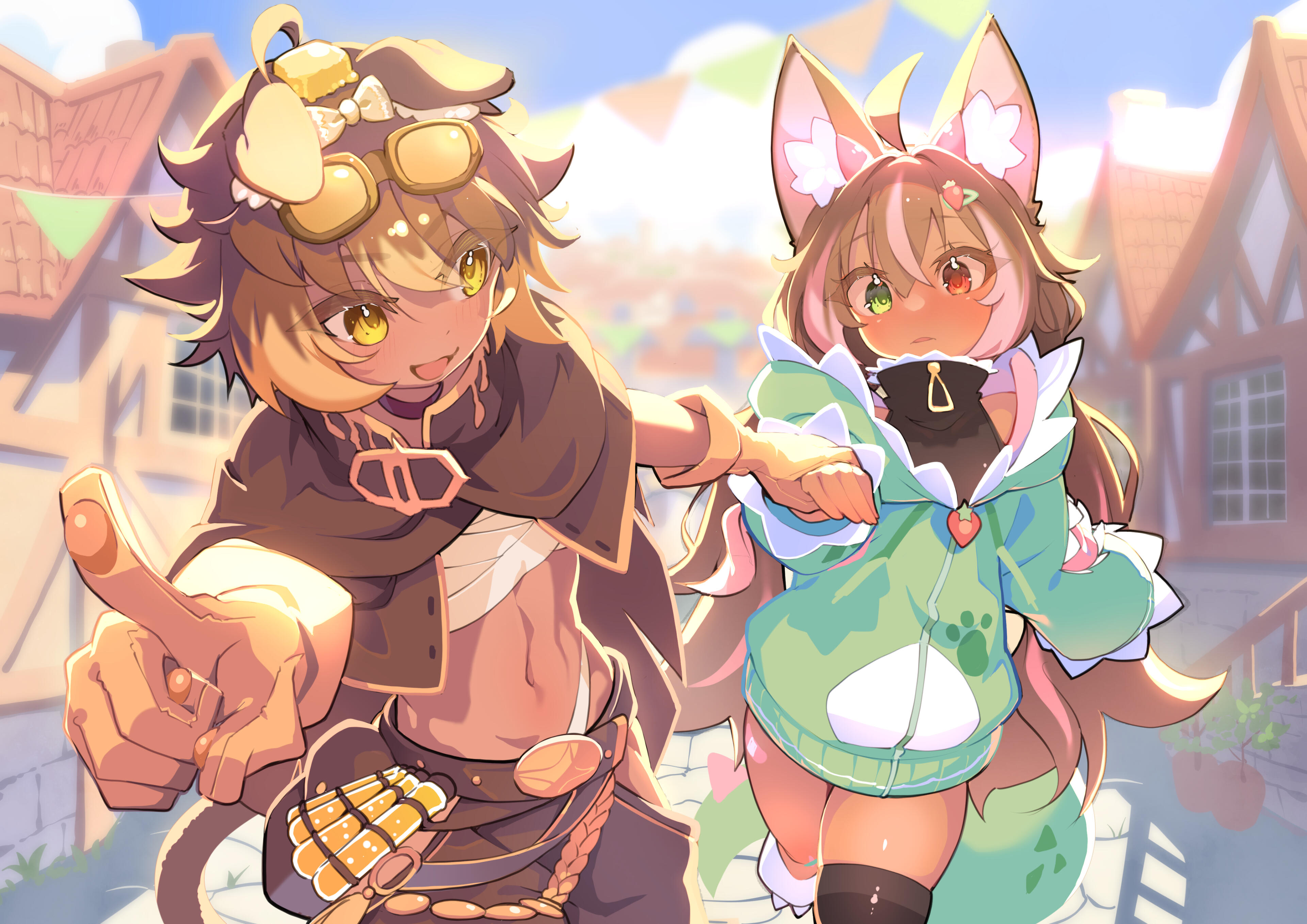 Once upon a time, in the village of Caershire (Kesh - Ur) , there was a renowned baker, a small boy adopted by two Wood Elves nick-named Fuwa. Fuwa owned their own bakery after the departure of their parents for the Great God War a war set on the God's versus their own creation. A pitiful mockery of their rebellion turned into a global scale. A few years later not hearing a word back, Fuwafa began cooking for the townsfolk. Being the number one seller of treats during the Autumn Dawn Festival, their fluffy, golden-brown croissants and pastries eventually made word, causing tourism in Caershire to skyrocket expotentially.After a few more years, their baking expertise would only grow, as word of Fuwafa’s legendary pancake cakes, a perfect combination of two of the realms greatest treats spread far and wide across the land. Citizens, bandits, and eldritch abominations would venture toward the small Wood Elf ran town to try some of these morsels for themselves. Even the king of Ashbourne himself had heard of it, and so, for his grand wedding, he personally requested Fuwafa to craft a towering masterpiece inspired by their famous creation. The biggest Pancake Cake ever concieved... to be delivered at his throne room.Fuwafa was adamant about this project at first, but time was against them. The deadline was impossibly tight with the wedding being only in a day. Harboring panic and in desperation, Fuwafa turned to the arcane arts, weaving a spell to hasten the baking process. As Fuwafa chanted a spell of Haste and Polymorph, golden light swirled throughout the bakery, lifting ingredients into the air with each move of Fuwa's fingertips. The magic was working until disaster struck.In their hurried state, Fuwafa accidentally knocked over a stack of utensils. The sudden clatter startled their pet kitty cat, who had been watching from the counter, playing with the empty bowl of milk. With a startled screech, the kibty cat leaped, only to slip on a dusting of flour. In a chaotic scramble, the cat flailed, its claws catching onto Fuwafa’s sleeve. Before they could react, both tumbled headfirst into the cauldron of enchanted batter.The spell, unfinished and unstable due to Fuwafa's early lack of proficiency, reacted violently. A blinding flash filled the bakery as the magic surged out of control. The last thing Fuwafa remembered was the warm scent of vanilla, a rush of golden light, and the sound of their cat’s panicked meow drifting deeper within their soul before everything went dark. The bakery was destroyed in an Arcanic Explosion, leaving Fuwafa's form to slowly regenerate over the course of a week under the rubble due to the nasty explosion. The reconstructed DNA, mistakenly taking the cat's as their own blended theirs together as a kemomoni hybrid was born from the ashes. Seeing their family legacy broken, having nothing else here left for them Fuwafa limped away from the debris, seeking out adventure and a new purpose in life. Alchemy would be the thing to cure them from their condition, all they needed now was knowledge and time. A way to unbind their DNA from the cat's being the only goal in mind as they ventured off to new horizions.