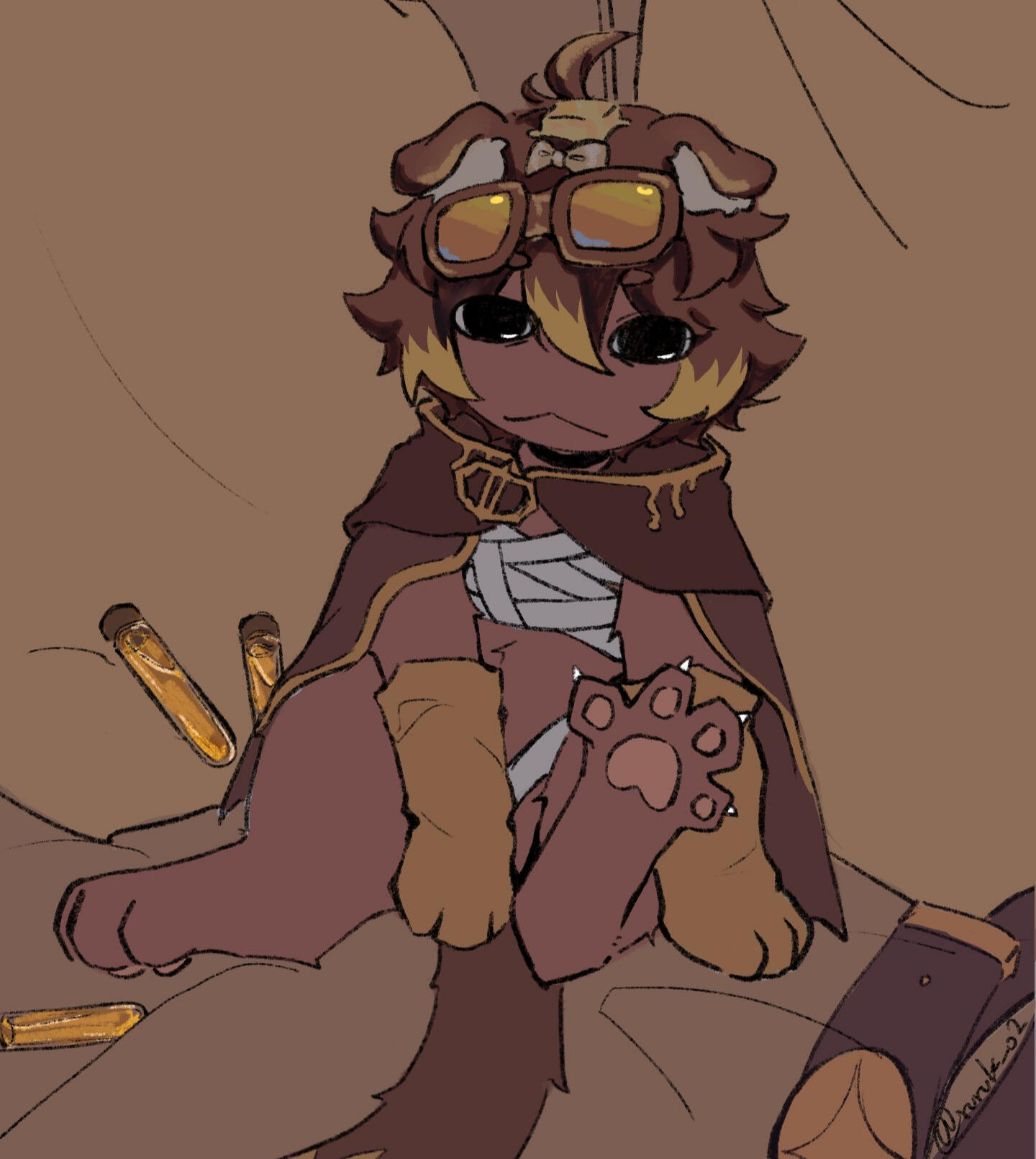 Fuwafa is very naive, yet caring adventurer. Considered to be "elite" they quite often are choosen for jobs, in which require their expertise. They specialize in Alchemy, Engineering, Magic, and Exorcising.Aside from Fuwafa's curious side, they are also quite laid back as they enjoy the days them and their party can relax, cooking whatever they find.Fuwa is NOT inept at combat, however they focus primarily on being the support role within his own party, heavily relying on magic and alchemy, along with other tools they invent. Just because Fuwafa does not rely on combat, does not mean they're weak. They possess great forms of durability due to their unique physiology, making them very hard to kill or injure.Fuwafa is an undead construct, meaning a lot of the tasks he does for leisure is purely out of habbit from his old life. Eating, sleeping, and working out acheives nothing for them besides making them feel human again.